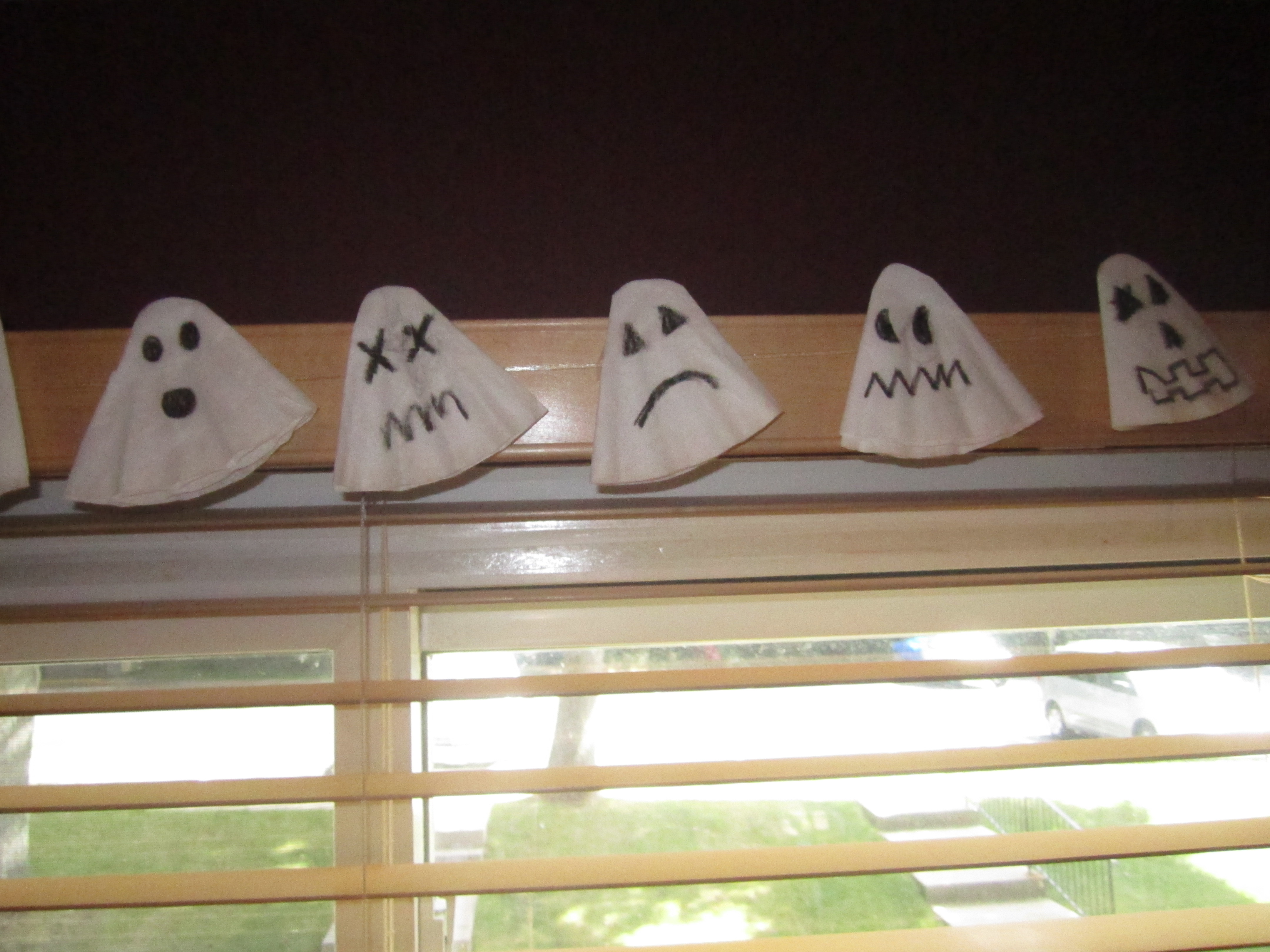 Repeat those steps over and over again until you have enough ghosts to add on the string. We put our garland above a window. We had to make quite a few so that the string of ghost garland would fit the top part of the window. After all the ghosts are completed tape each ghost side by side on the string. Finally hang up your ghost garland wherever you like.