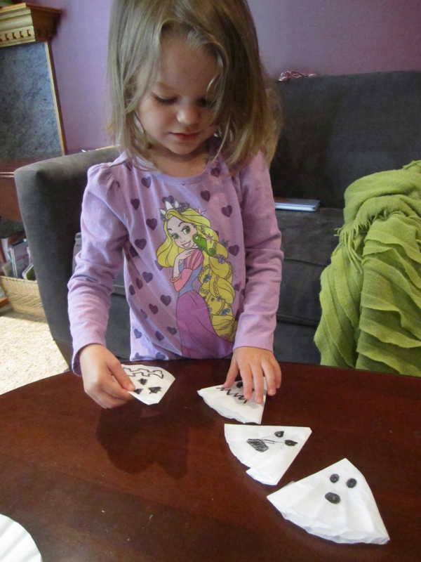 Take a white coffee filter and fold it in half. Next you want to fold the coffee filter in half again. The filter will look like a triangle. Glue or tape the filter so that it stays in that shape. On the top cut off the point to make the head of the ghost round. Decorate your ghost using black (or any color) crayon to your desire.