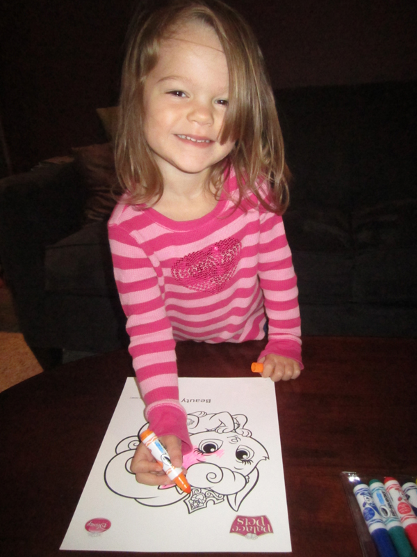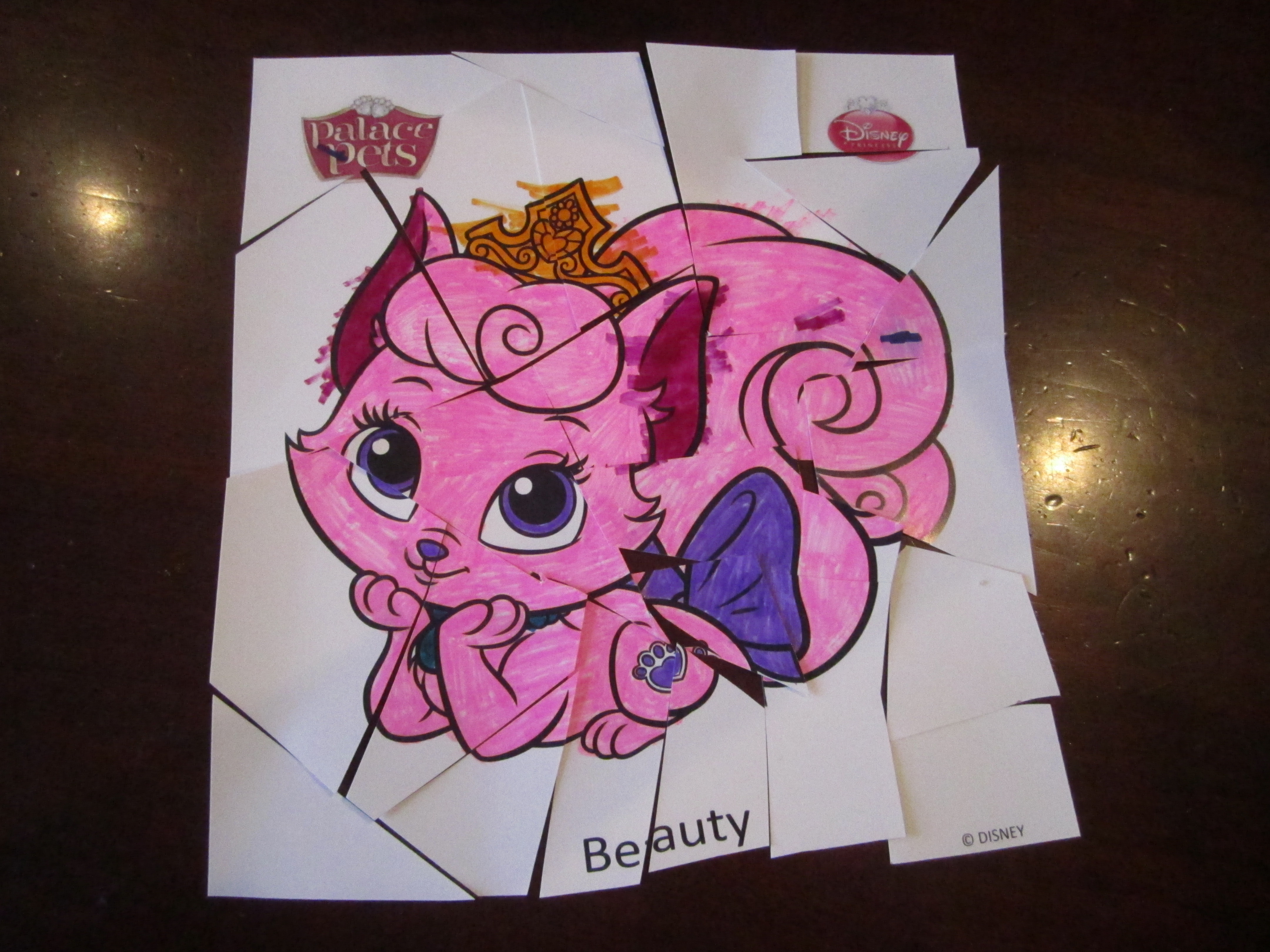 The cool thing about making your own is that your kids get to choose their theme. In this case Jordan wanted to make a puzzle of a Disney pet. I went online and found a coloring page of the Disney pet of her choice and we printed it out.