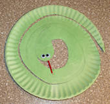 Color both sides of the paper plate. Draw on a spiral. Decorate the plate with the stickers. Draw a face on the circle in the center of the spiral. Carefully cut along the line of the spiral. Make a hole in the head of the snake, thread through a length of string and secure with a knot. Use the string to hang the snake. snake