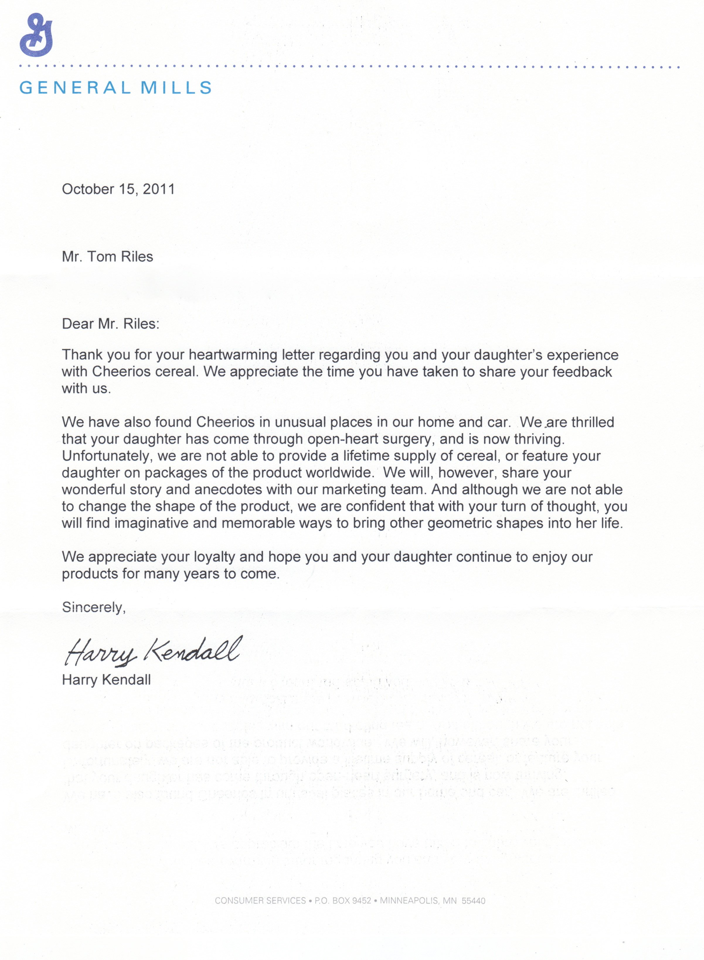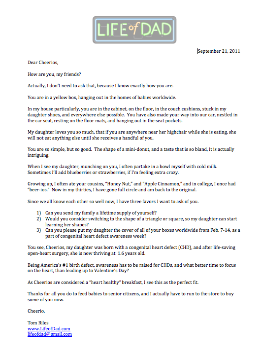 One month ago, I wrote the below letter to Cheerios, asking to (1) change their shape, (2) put my daughter on their box cover, and (3) send us a lifetime supply. Here is the original letter.