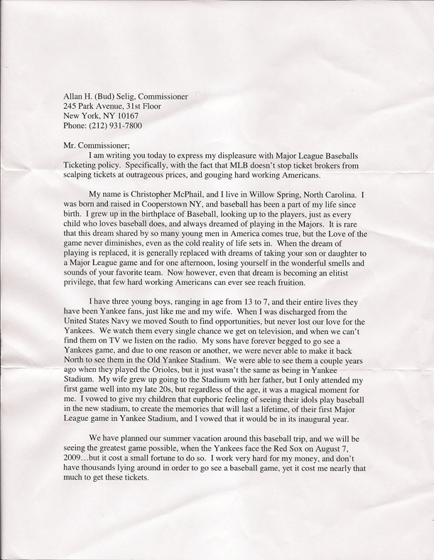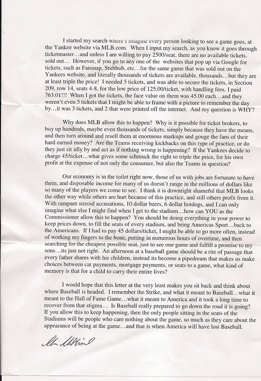 Let’s just say this was easier envisioned then accomplished. The ensuing battle to secure tickets prompted the following letter by me to Commissioner Bud Selig of the MLB: