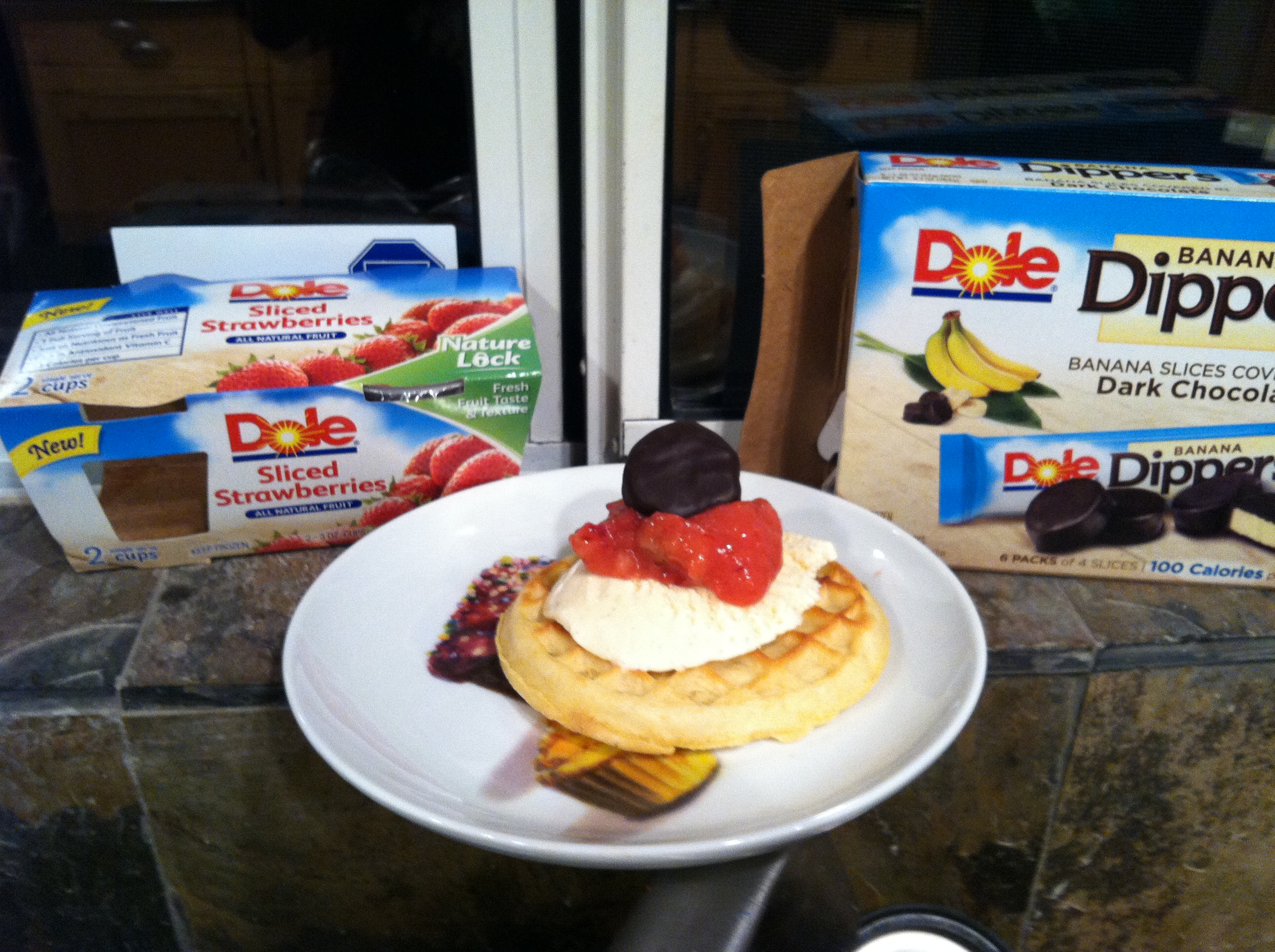 Waffles + Frozen Strawberries X Frozen Bananas dipped in Chocolate = Amazingness.