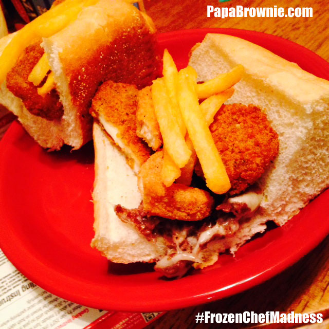 I present to you “The Fat Five Slamwich”! A crispy combination of mozzarella sticks, french fries, chicken tenders, sitting nestled atop a delectable cheesteak. This all sits nicely inside a halved Italian roll. He fakes right, crosses over left, takes it to the hole and SCORES with the Fat Five Slamwich!