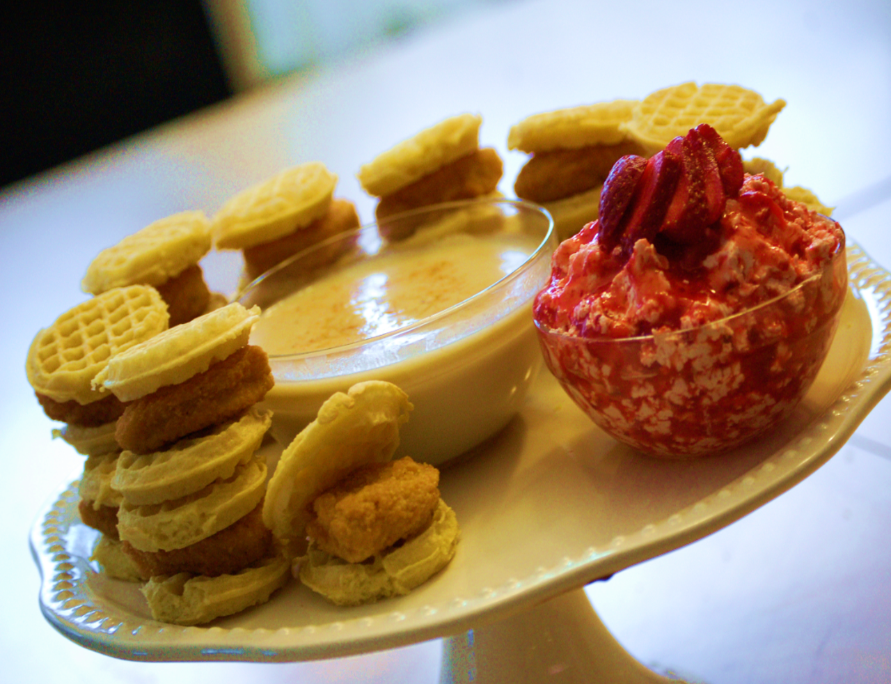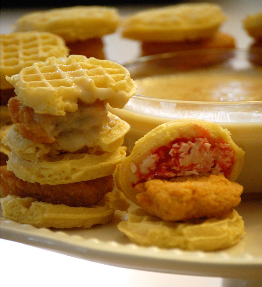 It’s the final minute and your team is down by one. You are incredibly hungry and you go to reach for a snack. What’s on the plate? A Chicken and Waffle Buzzer Beater Bite which you then dunk into a thick pool of sweet and salty Maple Butter Gravy or coat with a tangy helping of Whipped Strawberry Butter. He shoots. He scores! You win. Now grab another Chicken and Waffle Buzzer Beater Bite.
