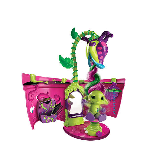 One of the most unique toys out there is the Zelfs toy line. For those who might not know who the Zelfs are here is some insight. They are playful creatures that live in and enhanted garden called Zardenia. Each one lives in their magical habitats. This set uses the magic of the Venus flytrap and transforms into a salon.