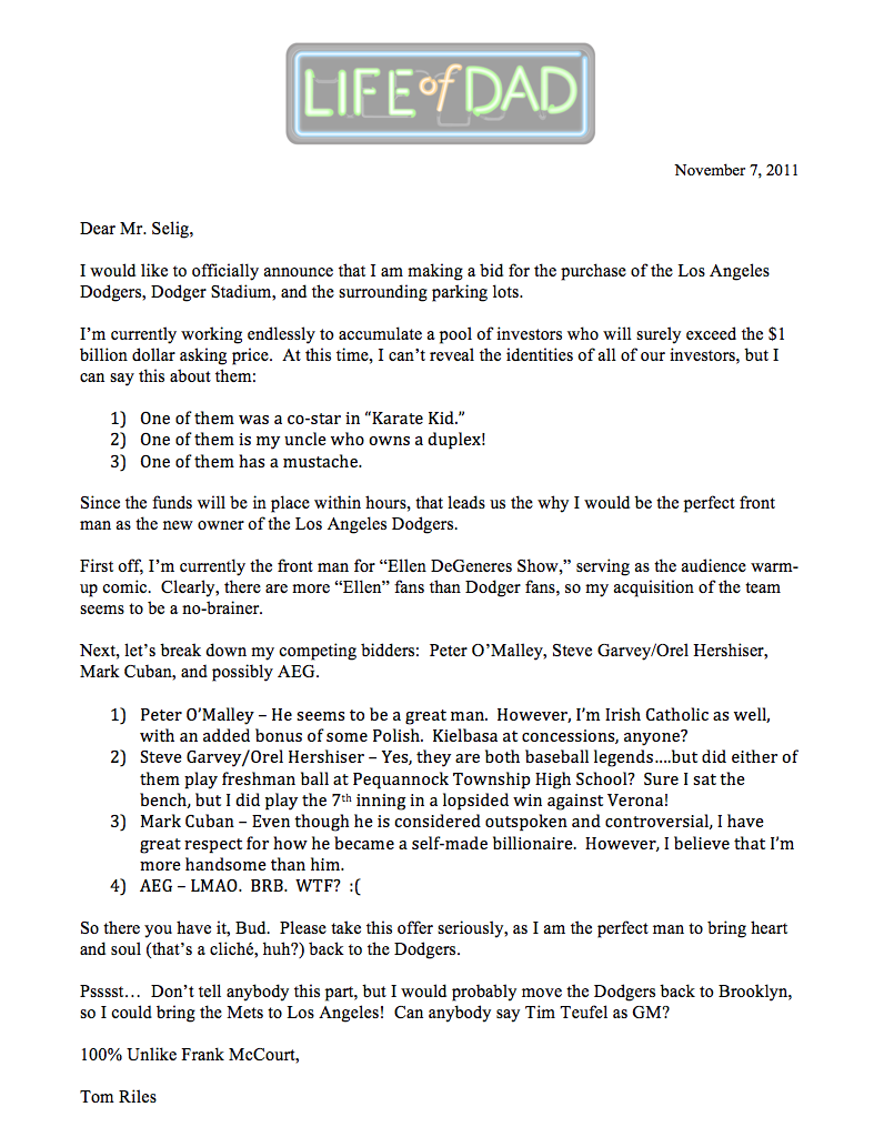 If you haven’t heard, the Los Angeles Dodgers are currently for sale.  Myself, and the team at Life of Dad are officially placing a bid on the team.