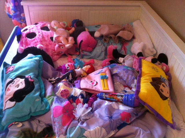 A few more nights went by like this and then we started to notice that we were unable to find our little girl when going to get her in the mornings….Where did she go??? All I could see was toys everywhere in her bed!
