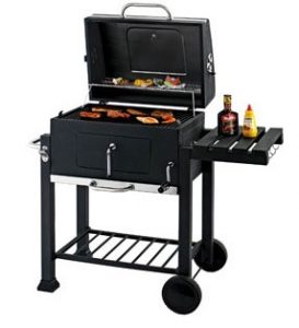My wife’s a Jersey girl and was looking for the best indoor grill and it had to be charcoal not gas. I wanted something easy to clean that looked snazzy like the kind you see in the Frontgate catalogs. I know those are gas, but still. And call me shallow, but I just couldn’t live with another little round Weber. Or even a big one. When I grew up grills didn’t look like big eggs on stilts. But really it has nothing to do with that – I just wanted something that was I don’t know substantial looking and rectangular. In answer to my prayers, a Kingsford 24″ charcoal “Chuckwagon” grill on sale at Wallmart and on display right at the front of the garden center. It looked like a shiny black and chrome Corvette. It had gleaming handles, doors, and vents and a stainless steelcrank to adjust the height of the coals – and even black shiny hubcaps for the wheels. I kid you not. And the best part, we also found stove and grill parts for less at pellethead.com.