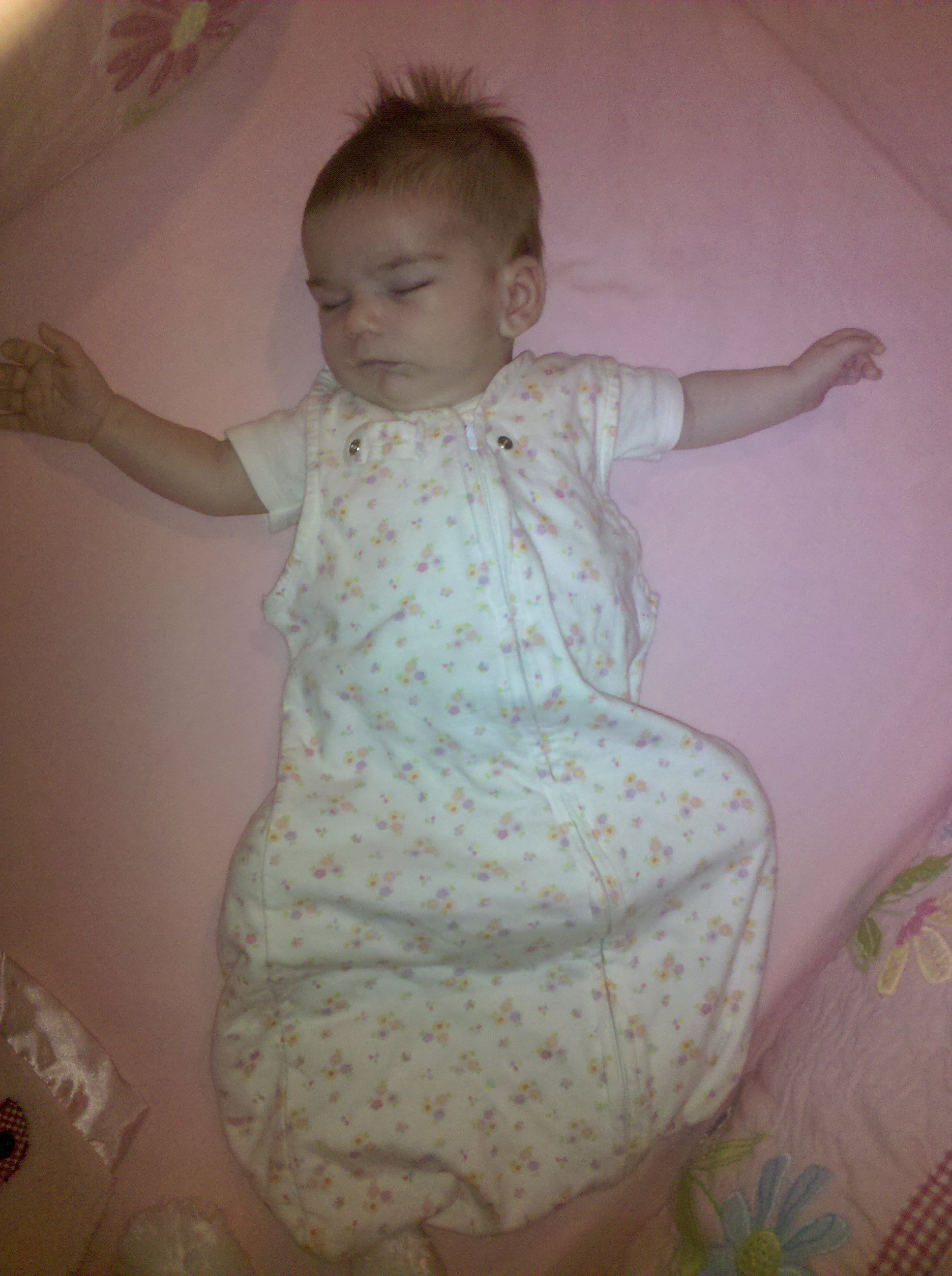 I’m staring at her baby monitor now, which is right next to my laptop, and she’s squirming, flailing her arms, and is suddenly laying diagonally. Wait a second, I didn’t lay her down diagonally. She repositioned herself on her own. She’s doing leg lifts with her nightgown that tucks in like a burrito³ at her feet. I had a burrito last night for dinner. Holy Crap.